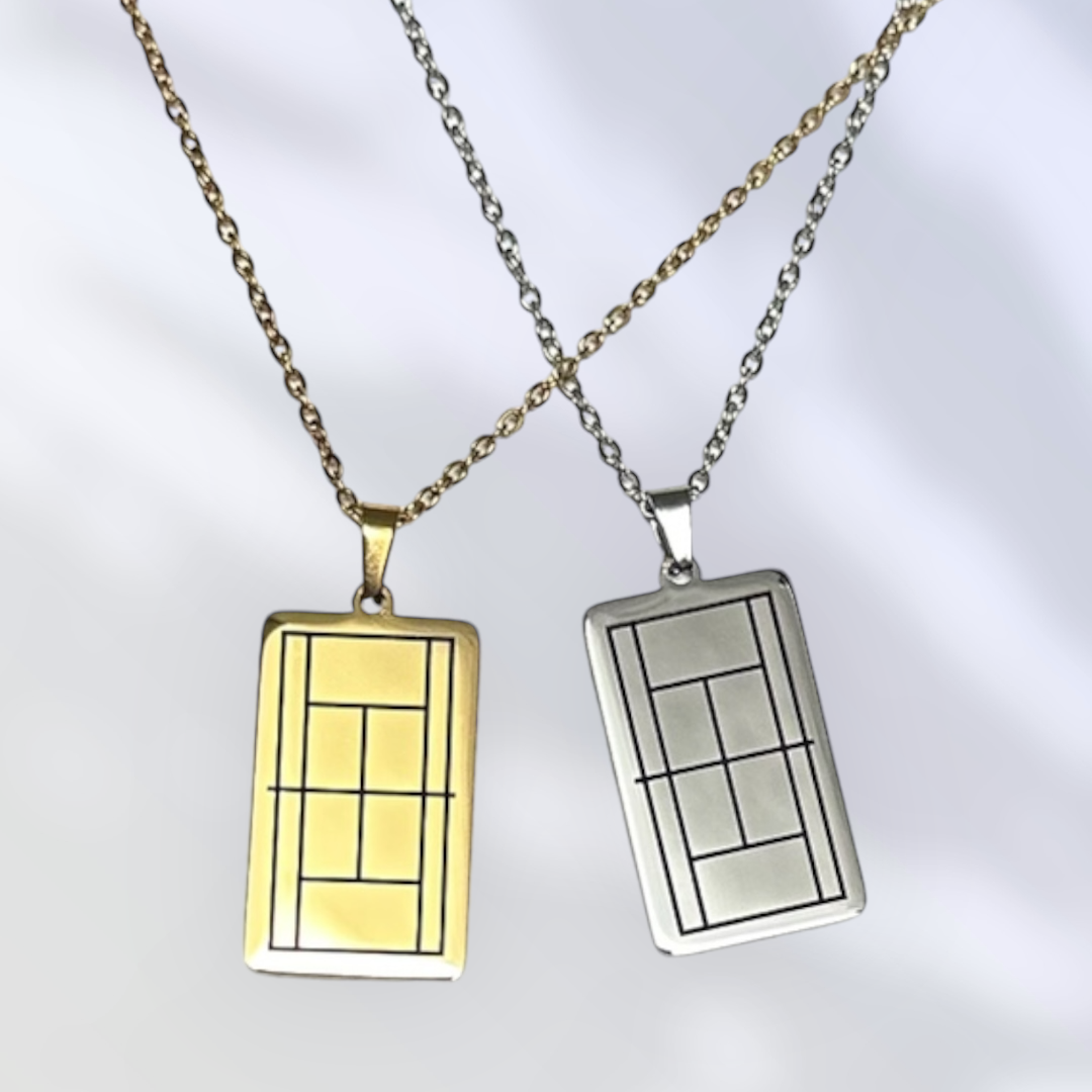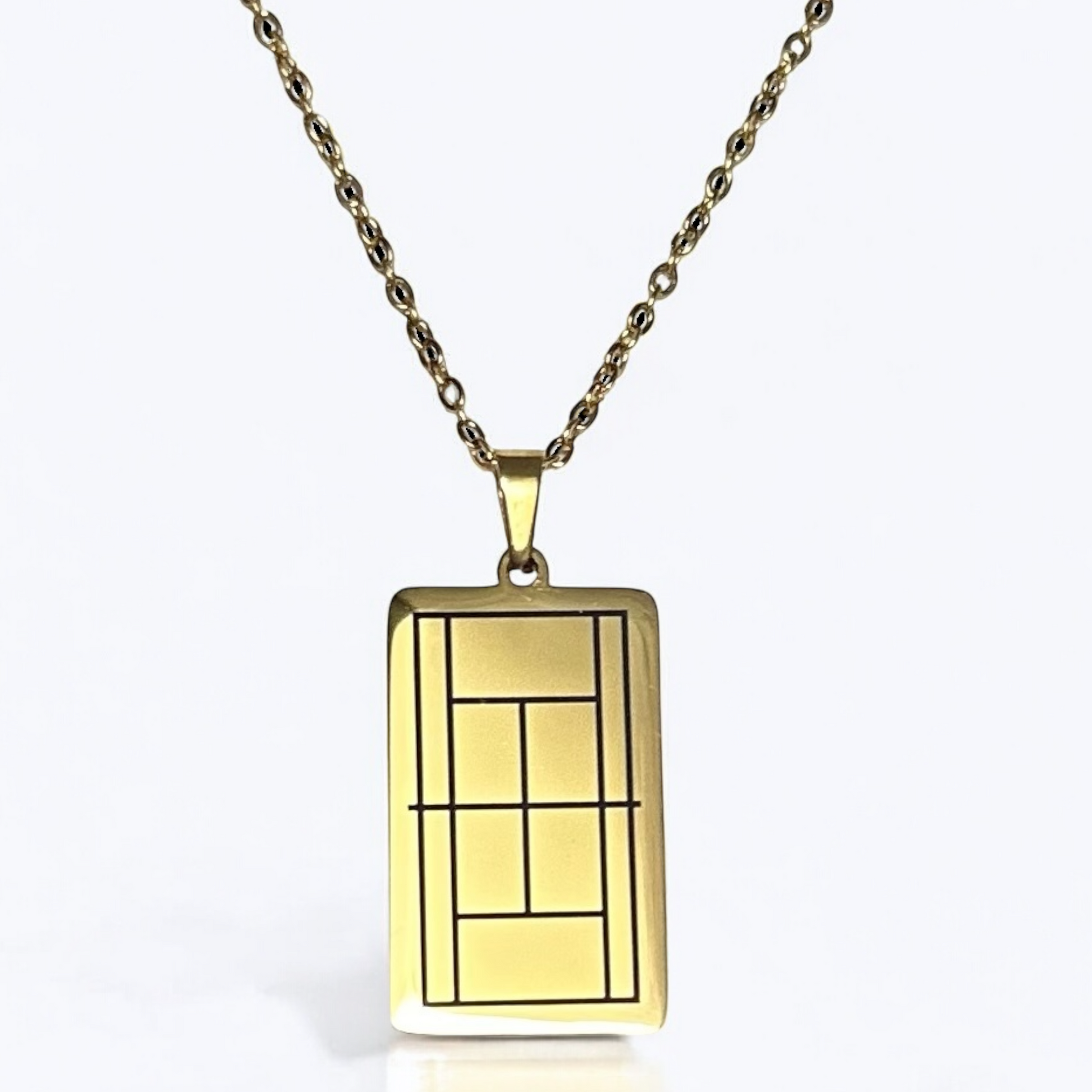Tennis Fans! Serve up some style with our Sporty Tennis Court Necklace. Made with stainless steel, this necklace features a laser etched design that makes a statement on and off the court. With its waterproof and non-tarnishing properties, you can wear it worry-free while playing or relaxing.
